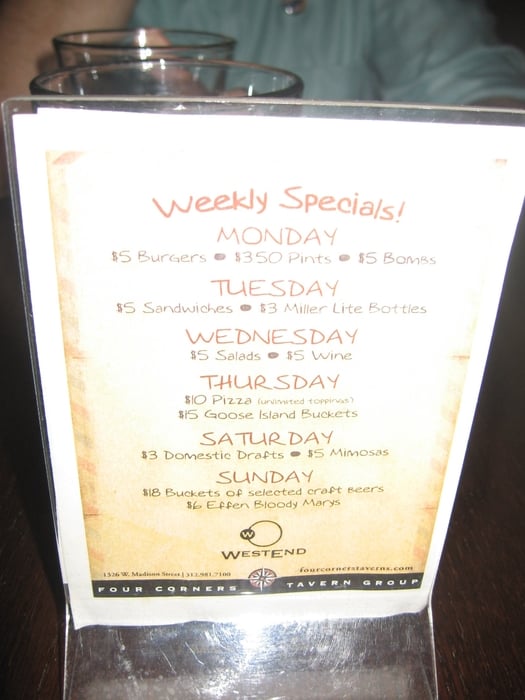 WestEnd is a chic sports bar located in Chicago, offering a diverse menu with American cuisine. The restaurant boasts various amenities such as outdoor seating, free Wi-Fi, and happy hour specials. Known for its extensive selection of appetizers, including bruschetta, meatballs, and fried calamari. Sandwich options like the 4C Smash Burger and Turkey Burger are customer favorites, while salads like the Italian and Caesar offer a lighter option. The reviews praise the attentive service and great atmosphere, making it a go-to spot for pre-game meals or casual gatherings. Overall, WestEnd provides a satisfying dining experience with delicious dishes and a welcoming ambiance.